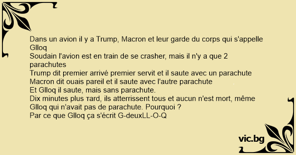 Dans un avion il y a Trump, Macron et leur garde du corps qui s'appelle Glloq