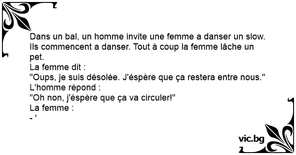 Dans un bal, un homme invite une femme a danser un slow. Ils commencent a danser. Tout à coup la femme lâche un pet.