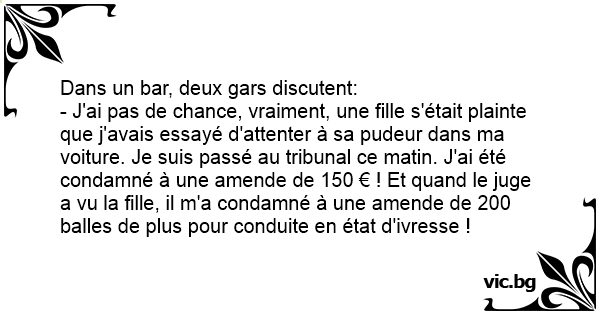 - J'ai pas de chance, vraiment, une fille s'était plainte que j'avais essayé d'attenter à sa pudeur dans ma voiture. Je suis passé au tribunal ce matin. J'ai été condamné à une amende de 150 € ! Et quand le juge a vu la fille, il m'a condamné à une amende de 200 balles de plus pour conduite en état d'ivresse !