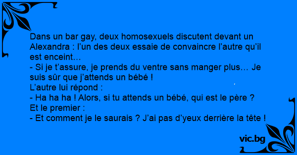 Dans un bar gаy, deux homosexuels discutent devant un Alexandra : l’un des deux essaie de convaincre l’autre qu’il est enceint…