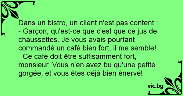 - Garçon, qu'est-ce que c'est que ce jus de chaussettes. Je vous avais pourtant commandé un café bien fort, il me semble!