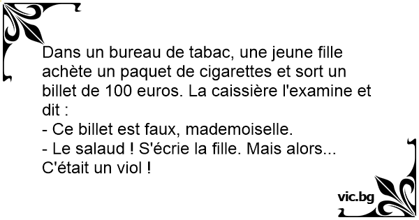 Komt een mooi sexy gekleed meisje de winkel binnen. Ze past een jurkje en keurt het goed. Ze komt bij de kassa en betaald met 1000 frank. Volgens de paarse lamp is het briefje vals. Waarop het sexy...