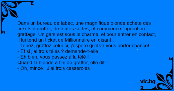 Dans un bureau de tabac, une magnifique blonde achète des tickets à gratter, de toutes sortes, et commence l'opération grattage. Un gars est sous le charme, et pour entrer en contact, il lui tend un ticket de Millionnaire en disant :