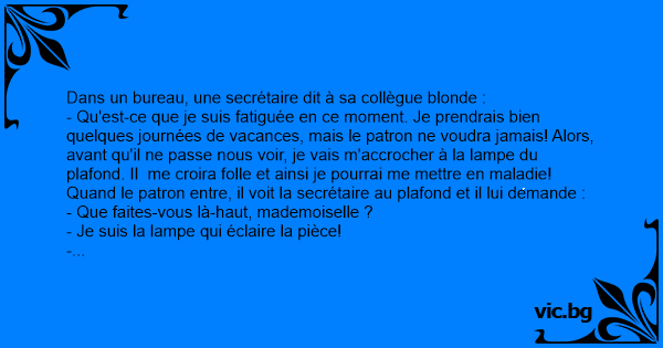 - Qu'est-ce que je suis fatiguée en ce moment. Je prendrais bien quelques journées de vacances, mais le patron ne voudra jamais! Alors, avant qu'il ne passe nous voir, je vais m'accrocher à la lampe du plafond. Il me croira folle et ainsi je pourrai me mettre en maladie!