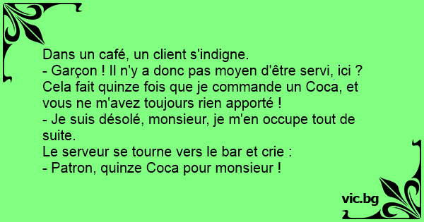 - Garçon ! Il n'y a donc pas moyen d'être servi, ici ? Cela fait quinze fois que je commande un Coca, et vous ne m'avez toujours rien apporté !