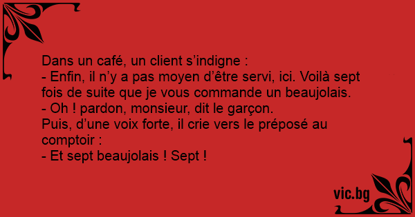 - Enfin, il n’y a pas moyen d’être servi, ici. Voilà sept fois de suite que je vous commande un beaujolais.
