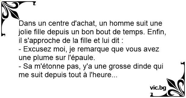Dans un centre d'achat, un homme suit une jolie fille depuis un bon bout de temps. Enfin, il s'approche de la fille et lui dit :