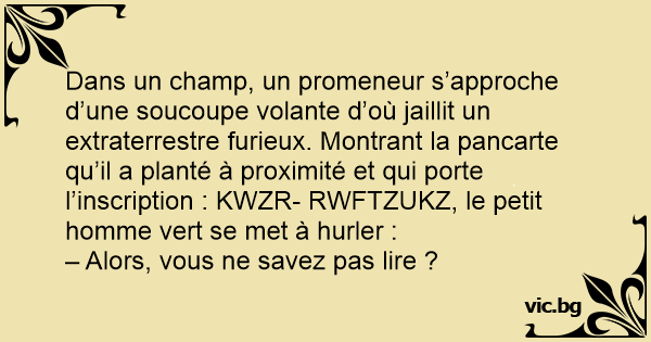 Dans un champ, un promeneur s’approche d’une soucoupe volante d’où jaillit un extraterrestre furieux. Montrant la pancarte qu’il a planté à proximité et qui porte l’inscription : KWZR- RWFTZUKZ, le petit homme vert se met à hurler :