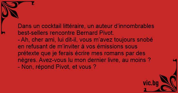 - Ah, cher ami, lui dit-il, vous m’avez toujours snobé en refusant de m’inviter à vos émissions sous prétexte que je ferais écrire mes romans par des nègres. Avez-vous lu mon dernier livre, au moins ?