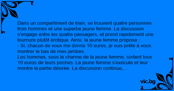 Dans un compartiment de train, se trouvent quatre personnes : trois hommes et une superbe jeune femme. La discussion s'engage entre les quatre passagers, et prend rapidement une tournure plutôt érotique. Ainsi, la jeune femme propose :