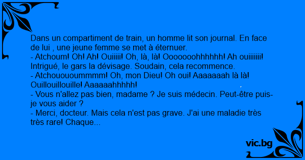 - Merci, docteur. Mais cela n'est pas grave. J'ai une maladie très très rare! Chaque fois que j'éternue, j'ai un orgasme!