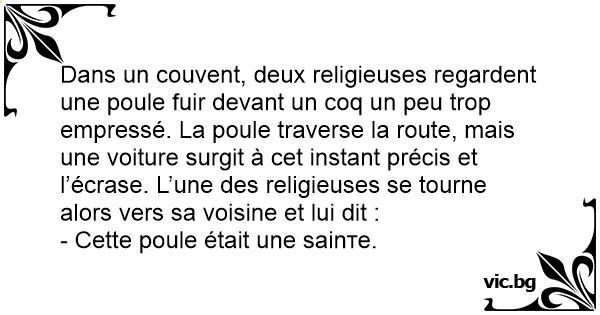 Dans un couvent, deux religieuses regardent une poule fuir devant un coq un peu trop empressé. La poule traverse la route, mais une voiture surgit à cet instant précis et l’écrase. L’une des religieuses se tourne alors vers sa voisine et lui dit :