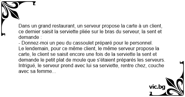 Le lendemain, pour ce même client, le même serveur propose la carte, le client se saisit encore une fois de la serviette la sent et demande le petit plat de moule que s'étaient préparés les serveurs.