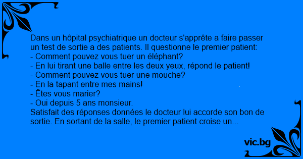 Dans un hôpital psychiatrique un docteur s'apprête a faire passer un test de sortie a des patients. Il questionne le premier patient: