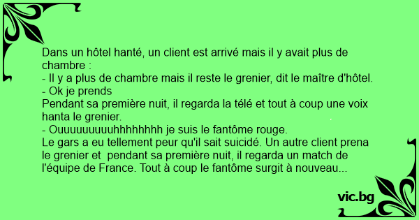 Le gars a eu tellement peur qu'il sait suicidé. Un autre client prena le grenier et pendant sa première nuit, il regarda un match de l'équipe de France. Tout à coup le fantôme surgit à nouveau :