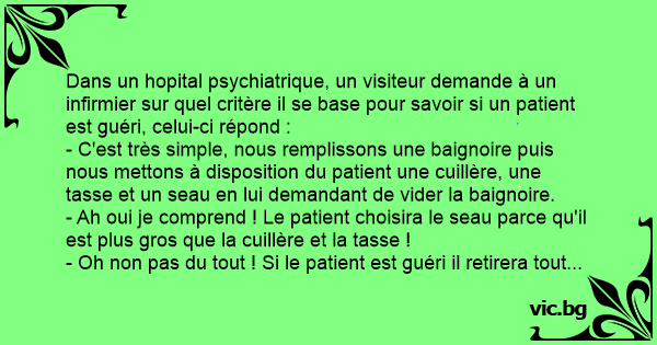 Прием во лудница Einliefern in die Irrenanstalt Τεστ Τρέλας Ψυχιατρικό τεστάκι Посетител в лудницата пита главния лекар: Durante a visita a um hospital psiquiátrico, um dos visitantes perguntou ao diretor: — Qual é o critério pelo qual vocês decidem quem precisa ser hospitalizado aqui? O diretor respondeu: — Nós enchemos uma banheira com água e oferecemos ao doente uma colher, um copo e um balde e pedimos que a... During a visit to the mental asylum, a visitor asked the Director what the criterion was which defined whether or not a patient should be institutionalized. “Well,” said the Director, “we fill up a... Tijdens een bezoek aan een gekkenhuis vraagt Prins Filip aan de directeur: "Welke zijn nu de criteria zijn om een patiënt terug gezond te verklaren?" Zegt de directeur: "Wij vullen een bad met... Voor de ouderen maar de jongeren kunnen hem ook doen De badkuip dementie test! Tijdens een bezoek aan een verpleeghuis vroeg de bezoeker aan de directeur wat het criterium is om een patiënt... Bir akıl hastanesini ziyareti sırasında, adamın biri sorar: Bir insanın akıl hastanesine yatıp yatmayacağını nasıl belirliyorsunuz? Doktor: Bir küveti su ile dolduruyoruz. Sonra hastaya üç sey... En högt uppsatt kommunistpolitiker besökte ett mentalsjukhus och blev visad runt av föreståndaren. – Hur tar ni reda på vilka som är tillräckligt tokiga för att bli inlagda? frågade kommunisten. –... Podczas wizyty w szpitalu psychiatrycznym gość pyta ordynatora, jakie kryteria stosują, aby zdecydować czy ktoś powinien zostać zamknięty w zakładzie czy nie. Ordynator odpowiedział: - Napełniamy... Jens S. besøkte psykiatrisk avdeling i Kristiansand og ble vist rundt av bestyreren. - Hvordan finner dere ut av om folk er gale nok til å bli innlagt? spurte Jens. - Vi fyller et badekar med vann,... Durante una visita a un Instituto Psiquiátrico, una de las visitas le preguntó al Director qué criterio se usaba para definir si un paciente debería o no ser Internado. "Bueno," Dijo el Director,... Újságíró riportot készít az elmegyógyintézetben. Azt kérdi az orvostól: - Hogyan állapítják meg egy páciensről, hogy már elhagyhatja a kórházat? - Vannak olyan feladataink, amivel bizonyíthatják... C'est l'histoire d'un journaliste tv qui va faire un reportage dans un asile de fous. Il demande au directeur : - Comment faites-vous pour savoir si votre patient est encore fou ? - Je le met... Certo dia, Lula resolve visitar um hospício com a dona Marisa. muito curioso, ele pergunta ao diretor: — Companheiro. . . quando um louco acha que não ta mais louco, qual o critério pra saber se... O doutor da clinica queria fazer um teste com os loucos entao encheu uma banheira de agua e foi fazer o teste com os loucos ate que surge um parente de um loco e pergunta: — Para que esse balde,... En känd politiker besökte nyligen ett mentalsjukhus och frågade nyfiket läkaren: - Men hur kan ni veta när en person behöver läggas in? Läkaren svarade: - Vi fyller ett badkar med vatten och... Eine Mann zum Psychiater: Was sind eigentlich die Aufnahmebedingungen in Ihrer Psychiatrie? Psychiater: Wir füllen eine Badewanne mit Wasser und stellen dann einen Löffel, eine Tasse und einen... Į psichiatrinę ligoninę ateina dirbti jaunas gydytojas ir iškart patenka į komisiją, kuri nustato ar pasveiko ligoniai. Slaugytoja pakviečia ligonį prie vonios pilnos vandens, ant kurios krašto... Un homme visite un hôpital psychiatrique et demande au directeur : - Comment pouvez-vous dire si une personne a besoin d'être internée ? - Nous remplissons une baignoire avec de l'eau et nous leur... In a Psychiatric Hospital, a Journalist asks the Doctor: "How do you determine whether to admit a person as a patient or not? Dr: Well ... we'd fill a bathtub with water and then give a teaspoon,... Under et besøg på en psykiatrisk afdeling spurgte jeg lederen, hvordan man kan afgøre, hvorvidt en patient burde indlægges eller ej. Lederen sagde: "Vi fylder et badekar med vand. Så tilbyder vi...