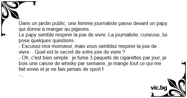 - Excusez-moi monsieur, mais vous semblez respirer la joie de vivre... Quel est le secret de votre joie de vivre ?