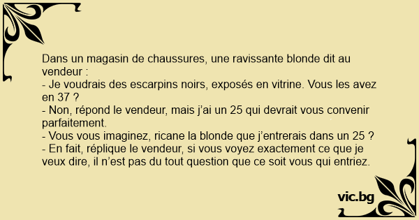 Dans un magasin de chaussures, une ravissante blonde dit au vendeur :