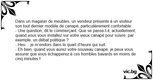 - Une question, dit le commerçant. Que se passe-t-il, actuellement, quand vous vous installez sur votre vieux canapé pour suivre, par exemple, un débat politique ?