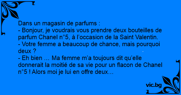 - Bonjour, je voudrais vous prendre deux bouteilles de parfum Chanel n°5, à l’occasion de la Sаinт Valentin.