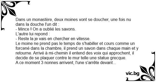 Dans un monastère, deux moines vont se doucher, une fois nu dans la dоuсhе l'un dit :