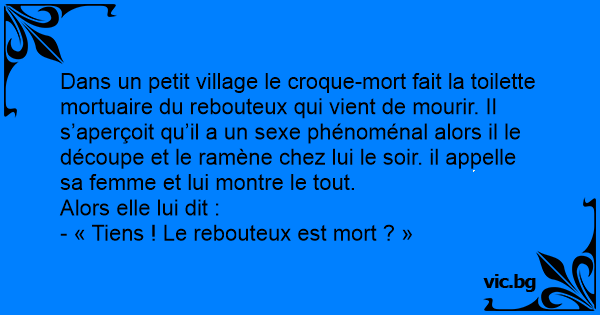 Dans un petit village le croque-mort fait la toilette mortuaire du rebouteux qui vient de mourir. Il s’aperçoit qu’il a un sexe phénoménal alors il le découpe et le ramène chez lui le soir. il appelle sa femme et lui montre le tout.