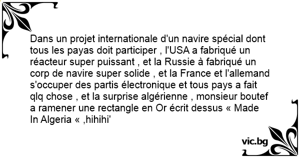 Dans un projet internationale d'un navire spécial dont tous les payas doit participer , l'USA a fabriqué un réacteur super puissant , et la Russie à fabriqué un corp de navire super solide , et la France et l'allemand s'occuper des partis électronique et tous pays a fait qlq chose , et la surprise algérienne , monsieur boutef a ramener une rectangle en Or écrit dessus « Made In Algeria « ,hihihi'