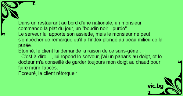 - C'est-à-dire ..., lui répond le serveur, j'ai un panaris au doigt, et le docteur m'a conseillé de garder toujours mon doigt au chaud pour faire mûrir l'abcès.