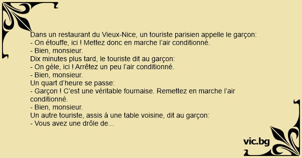 - Oh! vous savez, répond le garçon, l’essentiel est qu’il soit content. Parce qu’entre nous, nous ne l’avons pas encore fait installer, l’air conditionné.
