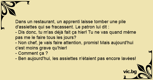 Dans un restaurant, un apprenti laisse tomber une pile d'assiettes qui se fracassent. Le patron lui dit :