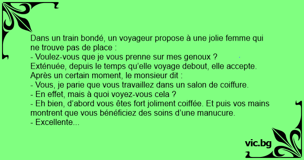 Dans un train bondé, un voyageur propose à une jolie femme qui ne trouve pas de place :
