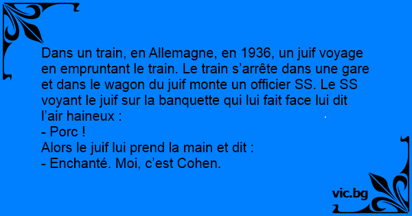 Dans un train, en Allemagne, en 1936, un juif voyage en empruntant le train. Le train s’arrête dans une gare et dans le wagon du juif monte un officier SS. Le SS voyant le juif sur la banquette qui lui fait face lui dit l’air haineux :