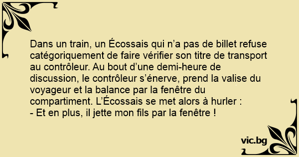 Dans un train, un Écossais qui n’a pas de billet refuse catégoriquement de faire vérifier son titre de transport au contrôleur. Au bout d’une demi-heure de discussion, le contrôleur s’énerve, prend la valise du voyageur et la balance par la fenêtre du compartiment. L’Écossais se met alors à hurler :