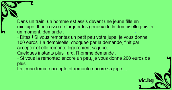 - Dites ! Si vous remontez un petit peu votre jupe, je vous donne 100 euros. La demoiselle, choquée par la demande, finit par accepter et elle remonte légèrement sa jupe.
