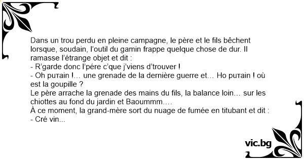 Le père arrache la grenade des mains du fils, la balance lоin… sur les chiottes au fond du jardin et Baoummm….
