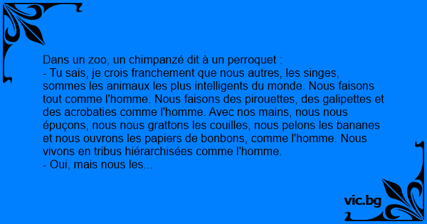 Dans un zoo, un chimpanzé dit à un perroquet :