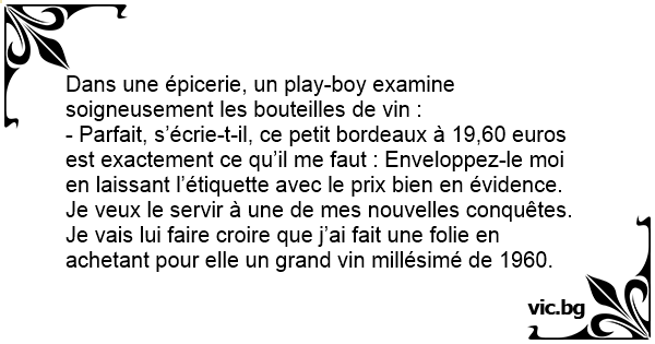 - Parfait, s’écrie-t-il, ce petit bordeaux à 19,60 euros est exactement ce qu’il me faut : Enveloppez-le moi en laissant l’étiquette avec le prix bien en évidence. Je veux le servir à une de mes nouvelles conquêtes. Je vais lui faire croire que j’ai fait une folie en achetant pour elle un grand vin millésimé de 1960.