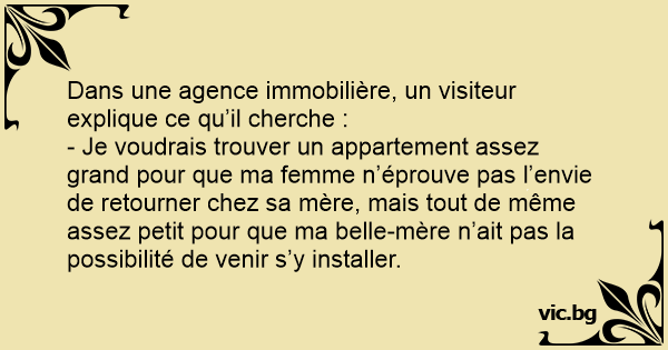 - Je voudrais trouver un appartement assez grand pour que ma femme n’éprouve pas l’envie de retourner chez sa mère, mais tout de même assez petit pour que ma belle-mère n’ait pas la possibilité de venir s’y installer.