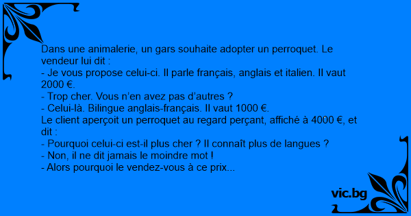 Un gars veut s'acheter un perroquet. Il en voit à la vitrine d'une animalerie. Il explique ce qu'il veut et le vendeur lui propose: - Je peux vous proposer celui-ci: Il est bilingue...