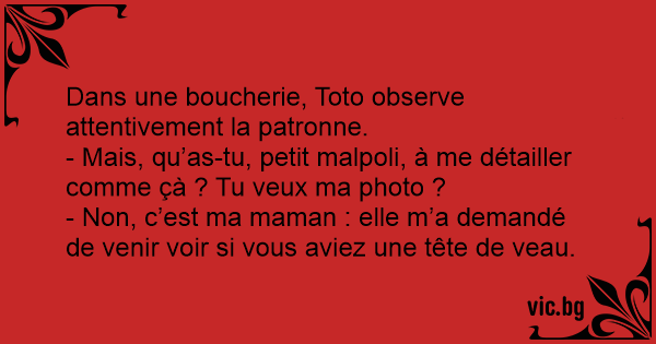 - Non, c’est ma maman : elle m’a demandé de venir voir si vous aviez une tête de veau.