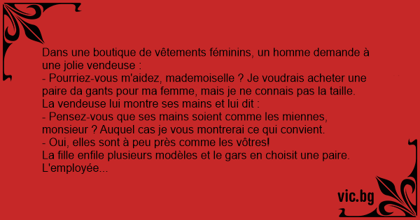 - Pourriez-vous m'aidez, mademoiselle ? Je voudrais acheter une paire da gants pour ma femme, mais je ne connais pas la taille.