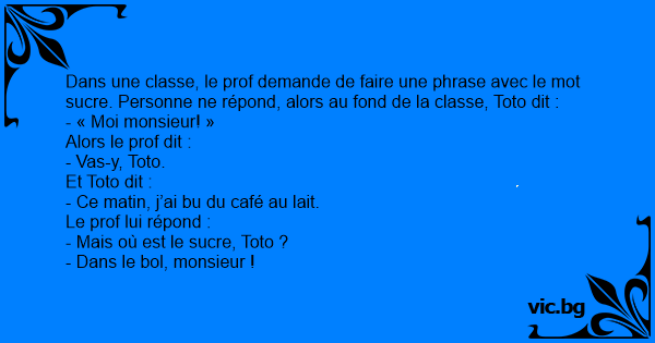 Dans une classe, le prof demande de faire une phrase avec le mot sucre. Personne ne répond, alors au fond de la classe, Toto dit :