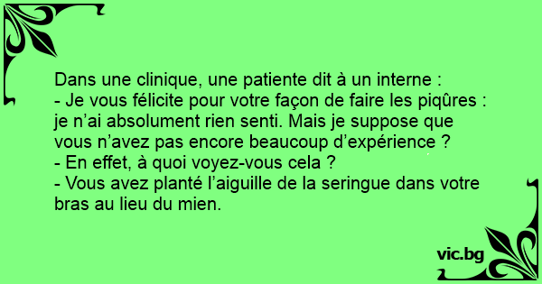 - Je vous félicite pour votre façon de faire les piqûres : je n’ai absolument rien senti. Mais je suppose que vous n’avez pas encore beaucoup d’expérience ?