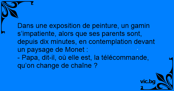 Dans une exposition de peinture, un gamin s’impatiente, alors que ses parents sont, depuis dix minutes, en contemplation devant un paysage de Monet :