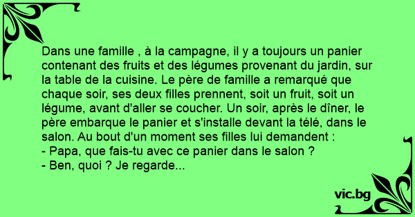 Dans une famille , à la campagne, il y a toujours un panier contenant des fruits et des légumes provenant du jardin, sur la table de la cuisine. Le père de famille a remarqué que chaque soir, ses deux filles prennent, soit un fruit, soit un légume, avant d'aller se coucher. Un soir, après le dîner, le père embarque le panier et s'installe devant la télé, dans le salon. Au bout d'un moment ses filles lui demandent :