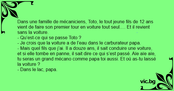 Карбуратор Water in the Carburetor Anruf in der Autowerkstatt Wasser im Vergaser Καρμπυρατέρ Περί γυναικών Жена притеснява по телефона мъжа си: Жена към мъжа си: — Любий, мені здається вода потрапила в карбюратор. — Ой, які ми розумні стали… На автах розуміємося. А ти хоч знаєш, де той карбюратор стоїть? — У машині… — А машина де? — У річці… A mulher liga toda esbaforida para o marido no escritório: — Querido, o carro não quer pegar... está com água no carburador. — Você já chamou um mecânico? — Não! — Então como é que sabe que o... Little Johnny runs to his dad and says, "Dad, there's water in the carburetor of the car!" "How can you be so sure?" the father asks. "I just know there is," replies Little Johnny. "Do... Дружина підходить до чоловіка: "Коханий, у мене машина зламалася, в карбюратор вода попала." - Та що ти розумієш! Ти взагалі не знаєш, що таке карбюратор! Де твоя машина? - У ставку... Mi esposa me dijo que el auto no estaba corriendo bien, que había agua en el carburador. Cuando pregunté donde estaba el auto ella me dijo: En el lago. Kona på 74 kom hjem til mannen sin og sa: – Kjære, bilen vil ikke starte, men jeg vet hva som er problemet. – Jaha, sa mannen tvilende. Og hva er problemet? – Det er vann i forgasseren, sa kona. –... Había una vez una señora que llama a su esposo y le dice: Cariñito, tuve problemas con el carro. Y el esposo le dice: ¿El carro? ¿Qué pasó? Nada, que creo que le entró agua en el carburador y por... Een vrouw komt op een middag thuis en zegt tegen haar man: "Schatje, de auto start niet meer, maar ik weet wat het probleem is" "Wat dan?" vraagt haar man. De vrouw antwoordt: "Er zit water in de... Une femme rentre chez elle après avoir fait les magasins. Son mari regarde le foot à la télé. - Chéri, dit-elle, il y a un problème avec la voiture. Elle ne démarre plus. - Un problème ? Avec ma... Телефонує блондинка чоловікові й каже: — Дорогенький, здається в карбюратор моєї машини потрапила вода. — Як вона... а ти взагалі знаєш що таке карбюратор? — здивоване запитує чоловік. — А де... Vaimo soittaa miehelleen: - Auton kaasuttimessa on vettä ja se ei oikein käynnisty. - Missä auto nyt on? - Järvessä. Wife: "There's trouble with car. It has water in the carburetor." Husband: "Water in a carburetor? That's ridiculous." Wife: "I tell you the cas has water in the carburetor." Husband: "You don't... Mergina skambina vyrui. - Brangusis į mano mašinos karbiuratorių vandens pribėgo. - Oho tu dar, net ir tokį žinai. Kur jis yra ar bent žinai? - Na dabar tai ežere... A esposa chega bêbada, doidona, e quase caindo em casa e diz pro marido: — Amor, ic... entrou água no carburador do nosso carro... E o cara diz: — Mas, como se você sabe, se você não entende nada... Kovácsné ziláltan ront be a lakásajtón: - Gyere gyorsan Józsi! Valami baj van a kocsinkkal. Víz került a karburátorba. - Na, ne már! Hogy kerülhetett víz a karburátorba? Hol van az autó? - A Dunában?! - Драги, мислам дека карбураторот се наполни со вода. - Знаеш ли ти воопшто каде се наоѓа карбураторот? - Па знам драги, во автомобилот. - А каде е автомобилот? - Ене го во езерото. Ao marido de Maria (Zé)chegar em casa, Maria diz : — Zéééééé ,o carro ta cum água no carburador!!! — Se nem sabe o que é carburador!!! - diz o Zé -Cade o carro??? — Vem vê!!! - diz a Maria... Ea: - "Draga, s-a Defectat masina. Cred ca are apa in Carburator." El: - "E ridicol! Tu nici Macar nu stii ce e ala carburator. Unde e Masina?" Ea: - "Pai in Piscina... O blondă vine la soţul ei: - Dragă, s-a stricat maşina! Are apă în carburator! - Iubito, tu nici nu ştii ce e ăla carburator. De unde ştii că are apă în carburator? Lasă că verific eu. Unde e... Manželka takhle jednou přijede z práce domů a povídá manželovi: "Drahý, v karburátoru je voda." "Voda v karburátoru? To je divný." "Opravdu, v karburátoru je voda." "Prosím tě, vždyť ty ani pořádně... - Brangusis, man atrodo, kad į karbiuratorių vanduo pateko… - Oi oi oi, kokia protinga, iš kur tokių frazių protingų prisirinkai? Tu bent žinai kur yra karbiuratorius? - Automobilyje… - O...