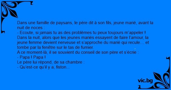 Dans une famille de paysans, le père dit à son fils, jeune marié, avant la nuit de noces :