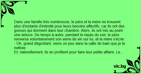 Dans une famille très nombreuse, le père et la mère ne trouvent plus d'instants d'intimité pour leurs besoins affectifs, car ils ont des gosses qui dorment dans leur chambre. Alors, ils ont mis au point une astuce. De temps à autre, pendant le repas du soir, le père renverse volontairement son verre de vin sur lui, et la mère s'écrie :