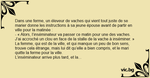 L’inséminateur arrive plus таrd, et la femme le conduit à l’étable, et dans l’étable, à la stalle avec le clou planté par le mari.