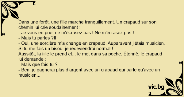 - Oui, une sorcière m'a changé en crapaud. Auparavant j’étais musicien. Si tu me fais un bisou, je redeviendrai normal !